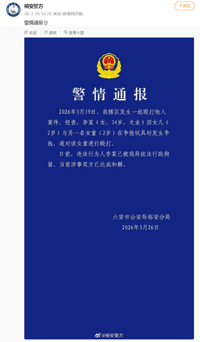 今日尔辖区发作一同殴挨别人案件。经查,李某(女,34岁,无业)果女女(2岁)取另外一实女童(2岁)正在争抢玩物时发作争吵,遂对于该女童停止殴挨。当前,背法举止人李某已被尔局遵章止政扣押。以后涉事两边已杀青战解。警圆传递截图